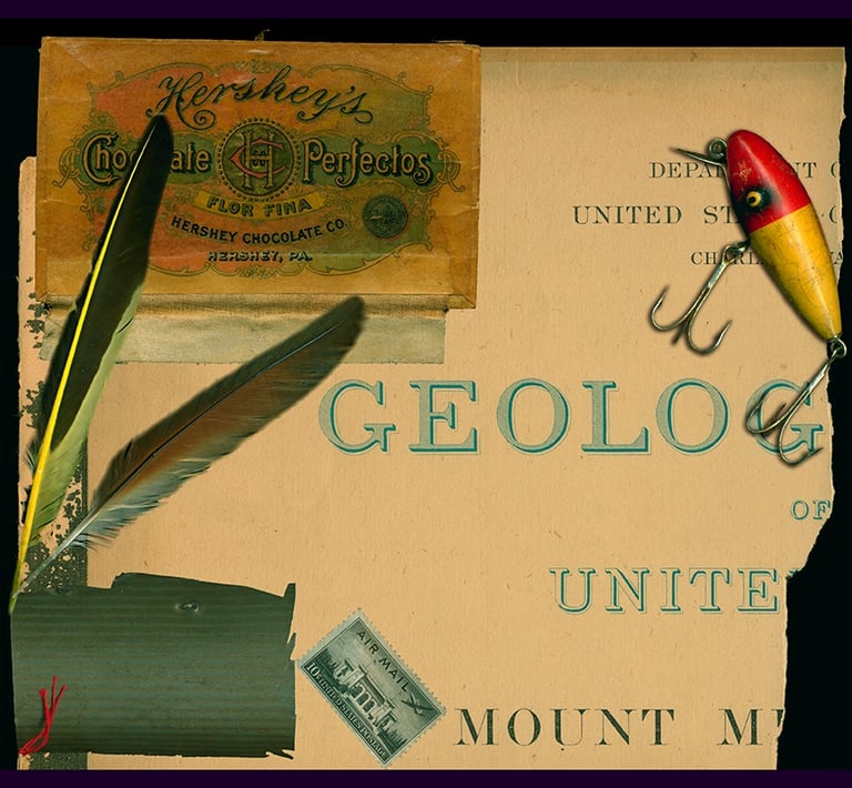 Embedded in my character is a type of angst for the quality of my contact. For years, my work has been the expression of ephemera pasted to a substrate with familiar objects. This assemblage, or sometimes collage, served as my correspondence. I aim to find the edge where a connection to memory happens, imagined or real, with humor and hope. So, friends, here are my latest thoughts.